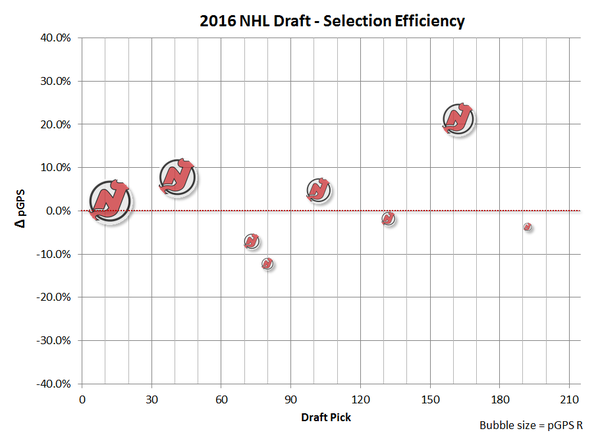 With eight selections, the Devils gave themselves a great chance to pull some NHL players out of the 2016 draft class. While the cumulative scouting-to-selection differences suggest that they reached on a few players, pGPS sees a very modest increase in value. pGPS predicts at least one full-time player with a good shot at two, but I wouldn’t be surprised to see each of McLeod, Bastian and Bratt getting a shot in the NHL – who sticks there is a matter for a later date.