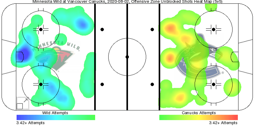 Minnesota’s defensive structure made it extremely difficult for Vancouver in game 1. The Canucks struggled immensely to get pucks to the slot and take shots from the most dangerous area on the ice. This was not surprising given the Wild’s track record over the 2019-20 season as they were one of the leagues best at protecting the home-plate area in front of their net.