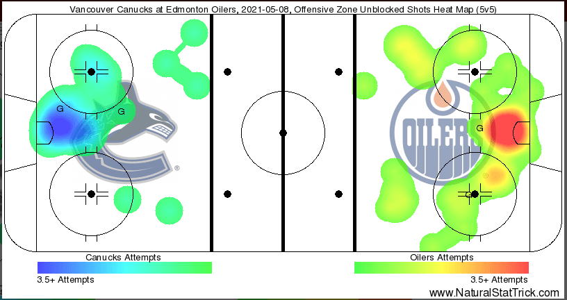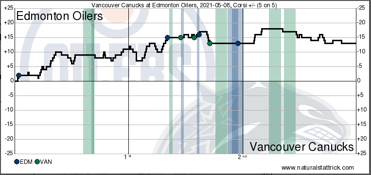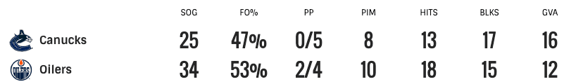 Almost immediately the script was clear. Loose coverage in transition led to a great chance for Jesse Puljujarvi. Demko made a strong save but the Oilers regained possession in the neutral zone. Then it was McDavid, flying down the right wing and ripping a shot off Alex Edler and through Demko’s legs. 1-0 Oilers.