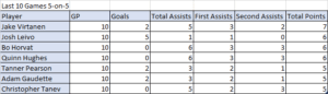 In the last 10 games for the Canucks Jacob Markstrom has played in 8 of them. He has played great posting a 0.916 SV% and 2.83 GAA. He’s saved 240 of 262 over that span and only Frederik Anderson has faced more with 270 shots against in 9 games played. The Canucks have to be careful not to overwork Marky. They have a couple of back to back games coming up December 28th and 29th and with Thatcher Demko out its the perfect time to give Michael DiPietro a chance to start and redeem himself after last years debacle. In Utica he has a 2.56 GAA and 0.910 SV%.