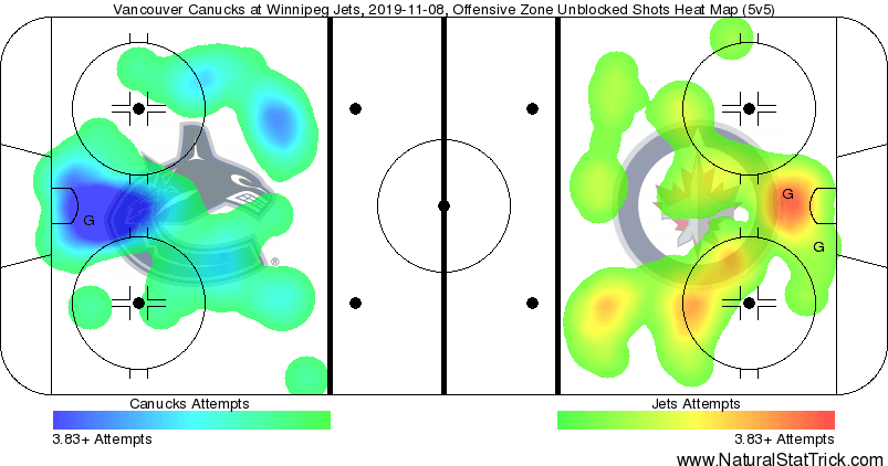 These are the kinds of heat maps that you want to see. The Canucks went hard in the slot, and they largely limited the ability of the Jets to put pressure on Demko from in close. If both teams had been icing league-average goalies on Friday night, the Canucks could have resoundly won this one.