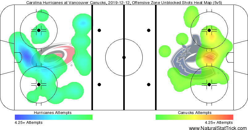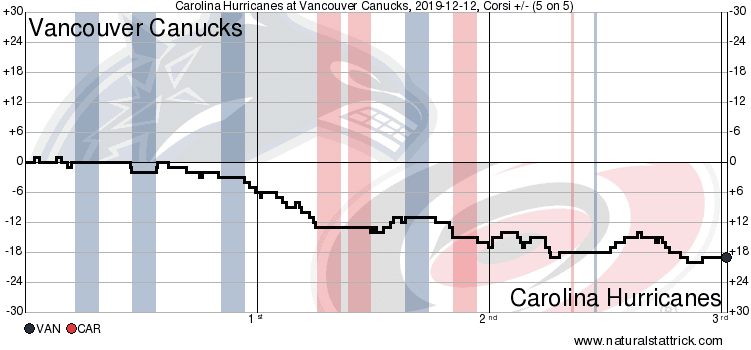 - It can’t be overstated how uneventful tonight’s game was. It was, in many, ways, the reverse image of Tuesday night’s outing against the Leafs, where the team outplayed their opponent and generated at least a dozen quality scoring chances, but were denied by a hot goaltender. We can consider tonight’s result to be a bit of karmic retribution for the Canucks, and particularly Jacob Markstrom, who put on a clinic against the Canes. He stopped 43 shots tonight, making it the most saves by a Vancouver netminder in a shutout performance since Corey Schneider also stopped 43 against the Avalanche in March of 2012.