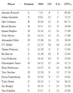 - I would be remiss if I didn’t discuss Jake Virtanen for a bit. Tonight Virtanen and his line were fantastic in driving possession and outshot-attempted the Flames by 64.71% while on the ice. Coming into this game, he was second only to Elias Pettersson for xGF% in the 12 games of December (51.14). Virtanen had a fantastic December. Let’s see if he can carry it into the New Year.