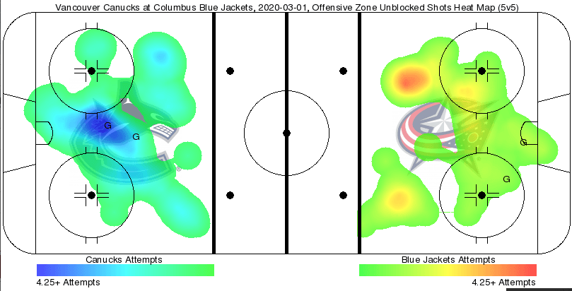 Halfway through the game the Canucks were being outshot 23-21 but had more than double the amount of scoring chances than the Blue Jackets.