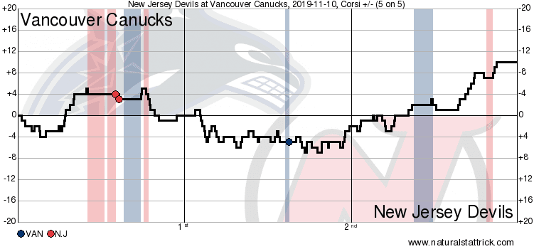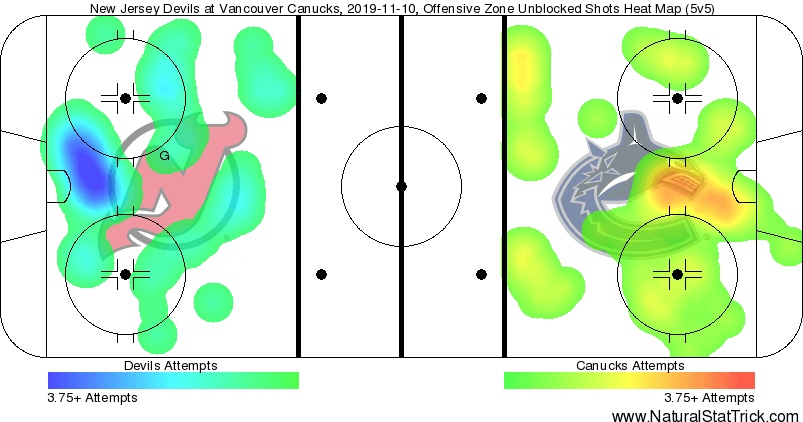 The Canucks put forth another disappointing performance this afternoon, dropping their fourth straight game to the lowly New Jersey Devils. In what is rapidly becoming a troublesome November for a team that looked dominant for most of the first month of the season, the Canucks have often looked fatigued and out of sorts, even when the underlying numbers have suggested they deserved a better result. It was more of the same tonight, as the Canucks were fighting the puck all night, even as they were able to sustain pressure in the Devils’ zone for much of the second half of the game.