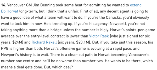 A smart representation will see these things and use them to extract as much value as possible from the organization. Given that Horvat’s representation is Newport Sports, it’s an easy conclusion to figure out that they know that have the upper hand here. Elliotte Friedman touched on the subject in this weeks ’30 Thoughts’, mentioning that Newport Sports has a history of waiting it out:
