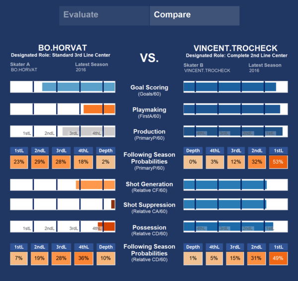 Horvat doesn’t match well with Trocheck in every category but looks roughly comparable to Bjugstad. Context is key though. Horvat is just starting to hit his stride. It won’t surprise me if he’s surpassed Bjugstad offensively by season’s end. By that same token, Horvat’s underlying data certainly doesn’t flatter.