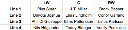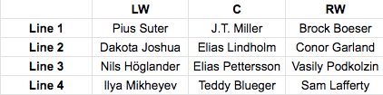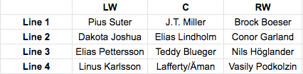 This one is a little out of the box, but I think it could help. They still reconnect Pettersson with his most familiar winger, Höglander, while also giving Teddy Blueger some much-deserved extra playing time.