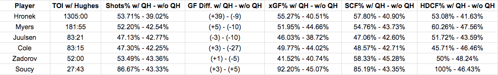 As you can see, in almost every analytical statistic, the Canucks defender played better with Hughes than away from him. And that shouldn’t be a surprise; players should play better when they’re on the ice with Hughes. Heck, there’s a reason he’s the betting favourite for the Norris trophy. But the discrepancy in their stats when they’re away from Hughes is astronomical, considering this team won 50 games this season.