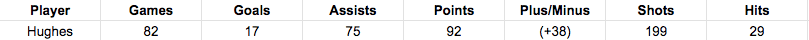If you hadn’t already thought this was Hughes’ best season, all of these stats listed are career highs. Not just career highs, but across the league, he ranked sixth in goals, first in assists, first in points, ninth in shots on goal, and fourth in plus-minus of all NHL defencemen.