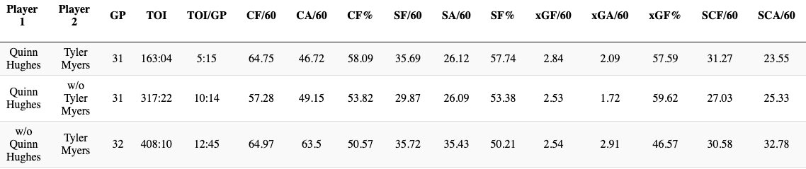 The defence pairing of Myers and Edler have a higher CF/60 at 68.05 than Hughes and Tanev do at 55.49. That being said, the pairing of Hughes and Tanev were much better at keeping opposing scoring chances to a minimum when they were together.