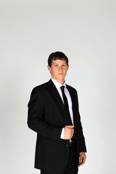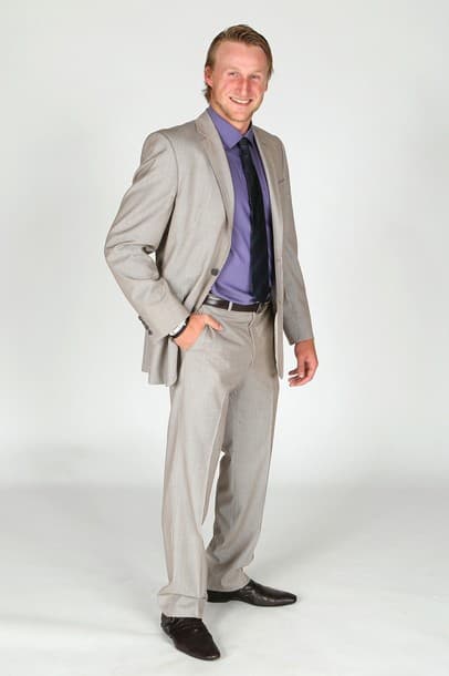 This is a terrible fit. He looks like he borrowed it from his dad’s closet. Honey, you’re an NHLer now. You can afford to go custom! But his awwhh shucks charm is off the charts so he can get a virgin pina colada and some cookies and wear whatever he likes.