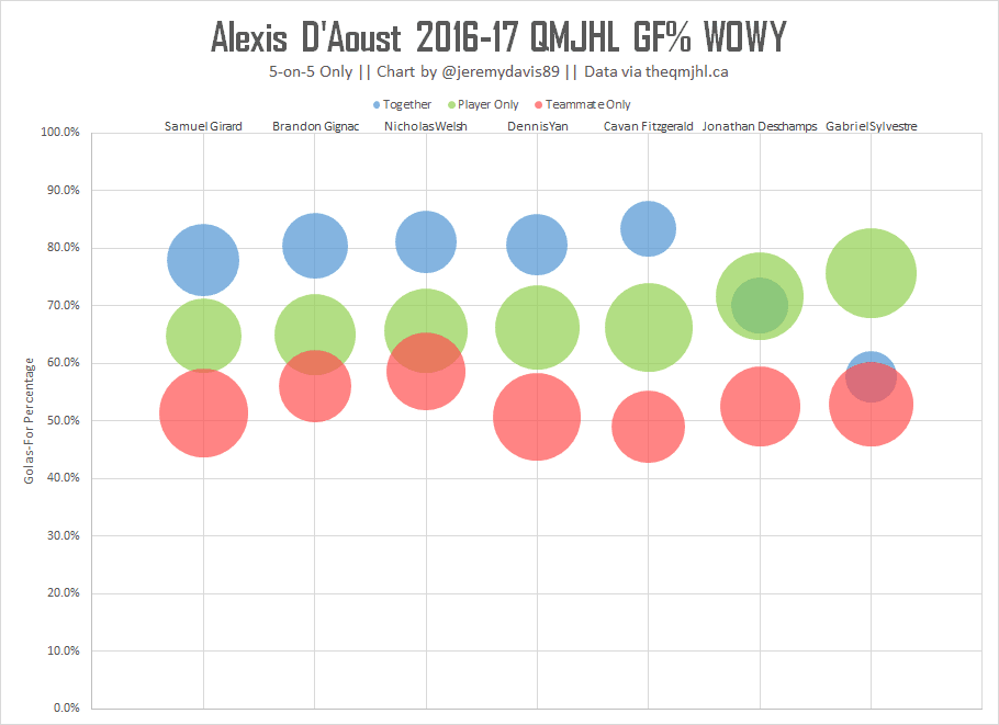 The fall in D’Aoust’s production rate led to a corresponding fall in his statistical projection, from 9% last season in his draft-plus-two year to 2% this year. Abysmal, yes, and we don’t often expect players who are playing as overagers in the QMJHL to accomplish much, but D’Aoust’s on-ice numbers are particularly attractive. While D’Aoust was on the ice, the Cataractes scored a massive 70.8% of the 5-on-5 goals that occurred – that was the fourth highest ratio in the entire QMJHL, and two of the names above him are high end NHL prospects (Thomas Chabot and Daniel Sprong). His GF%rel of +17.6% was sixth highest in the Q. He has a pretty clear positive impact on his linemates, so there are some good signs here.