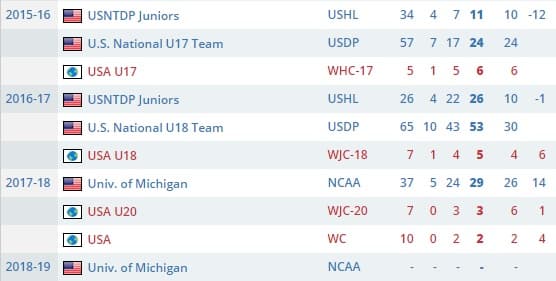 (Quinn Hughes stats starting with his first year with the USNTDP Junior Team of the USHL, courtesy of eliteprospects.com)