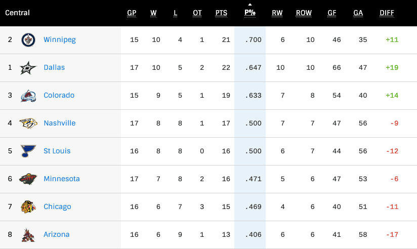 At the time of this writing, the Jets sit just one point back of the Stars. Sorted by points percentage, however, the Jets are the top team in the Central.