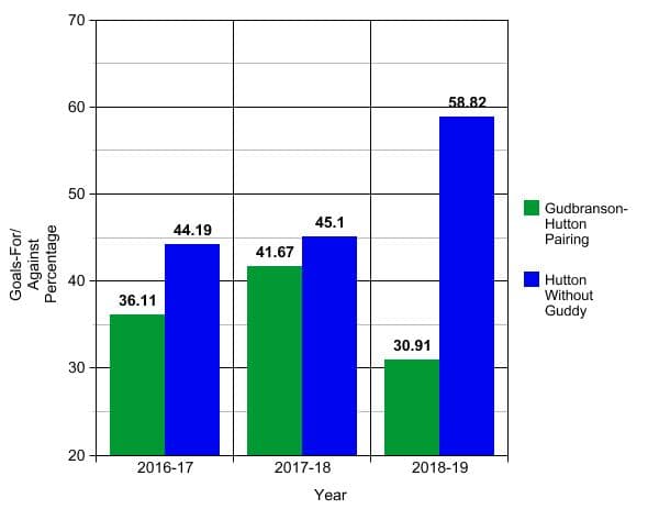 In Gudbranson’s first season he was only healthy for 30 games, and in those 30 games he was paired up with Ben Hutton 85.2% of the time in five on five situations. This had to limit the potential for growth in Ben Hutton’s game as that season he saw a noticeable drop in five on five scoring, dropping down to only eight points in 71 games, compared to his rookie season that saw him stack up 18 points five on five points in 75 games.