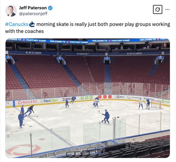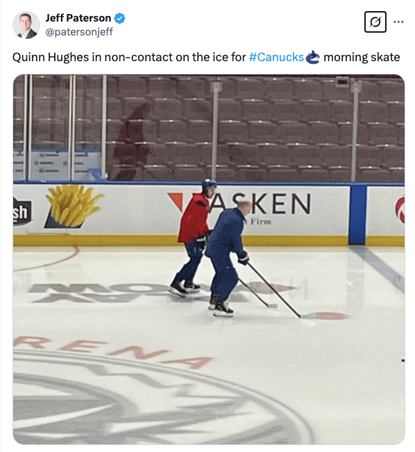 Rick Tocchet on the progress Quinn Hughes is making: “I don’t know about his status tomorrow, but it was a good day for him. He obviously did a little bit more than he has done, so he looked pretty good. But we didn’t have contact drills and stuff like that. So it’s hard to evaluate him. He felt really good yesterday, so we’ll go from there.”