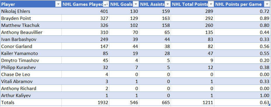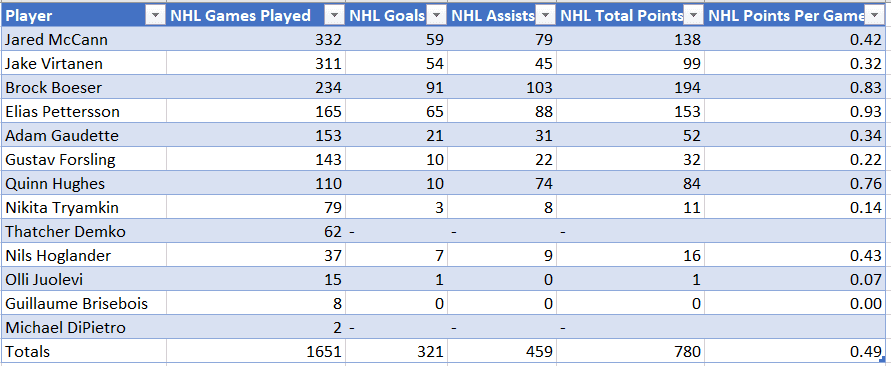 Here are the final lists of NHLers for Sham and the Canucks. Canucks point per game totals exclude goaltender games played:
