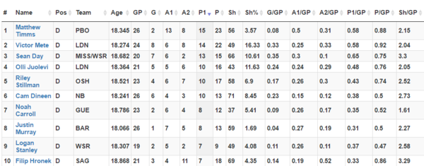 Among 18-year-old defencemen, Juolevi ranks fourth in goals, primary points, and primary points-per-game. He’s also third in goals-per-game and ranks in the top 10 in primary assists. All this just serves to underline that Juolevi remains an elite draft+1 defenseman at the OHL level.