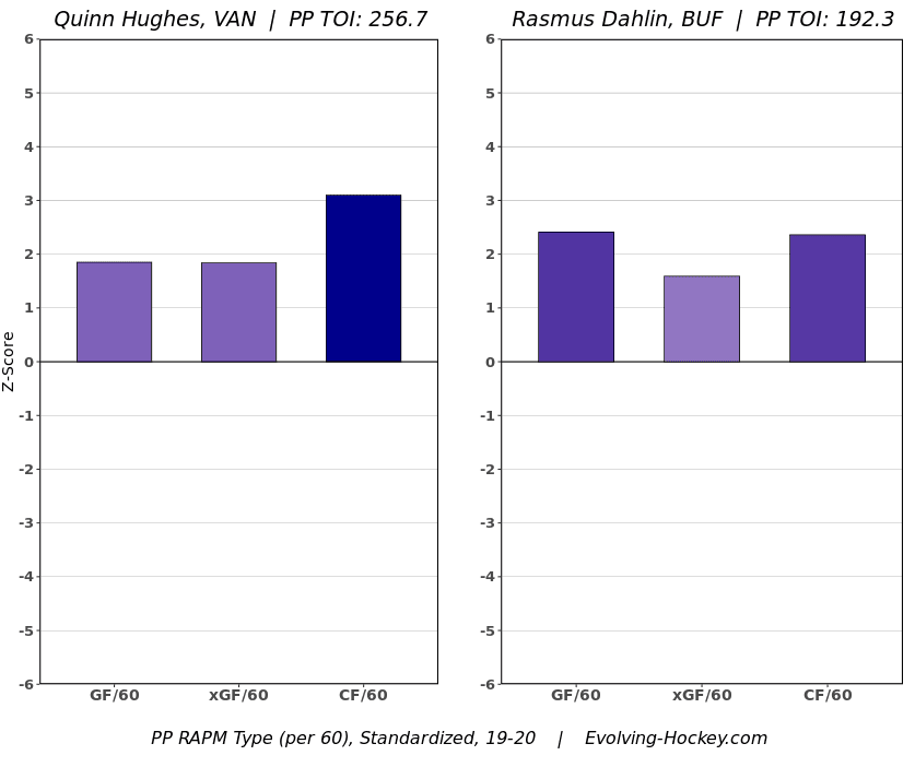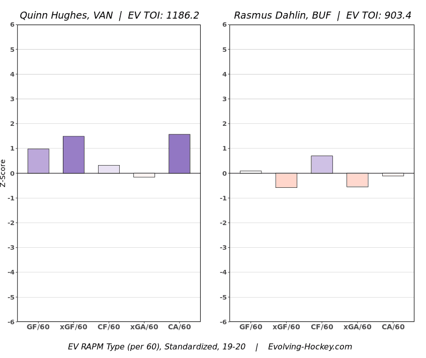 Traditional stats lean Hughes’ way, with Quinn putting up 8 goals and 53 points this past season compared to Dahlin’s 4 and 40. Looking at the advanced numbers courtesy of Evolving-Hockey.com, Hughes has Dahlin beat in almost every key category at even strength for this past season, despite Dahlin having an extra season of NHL experience under his belt.