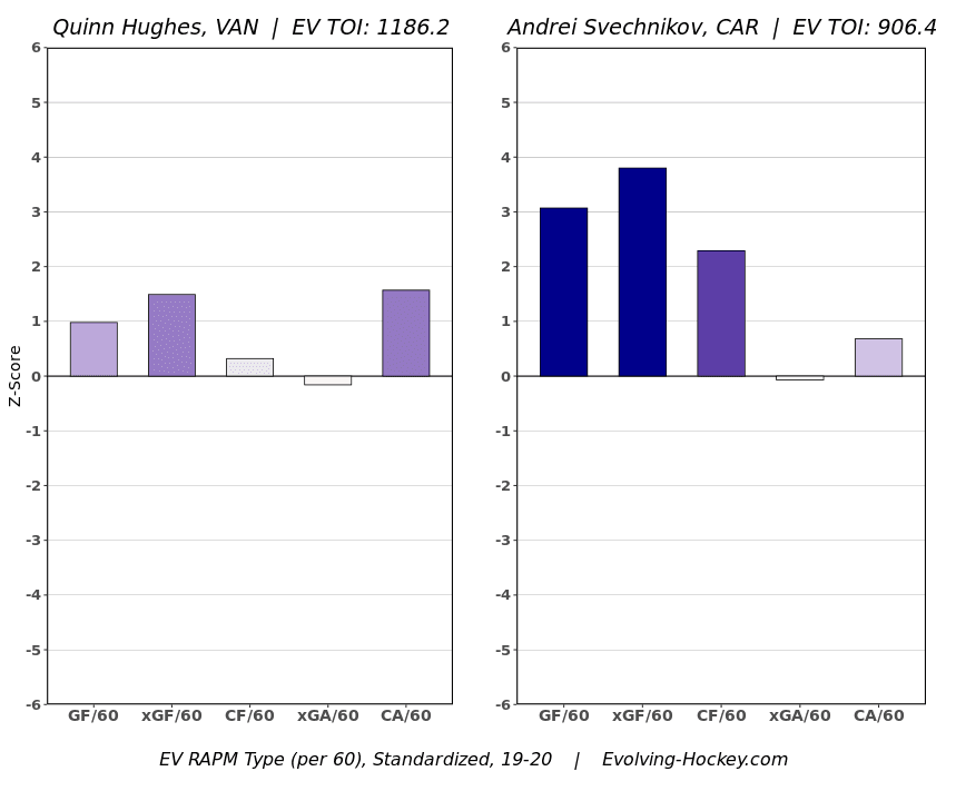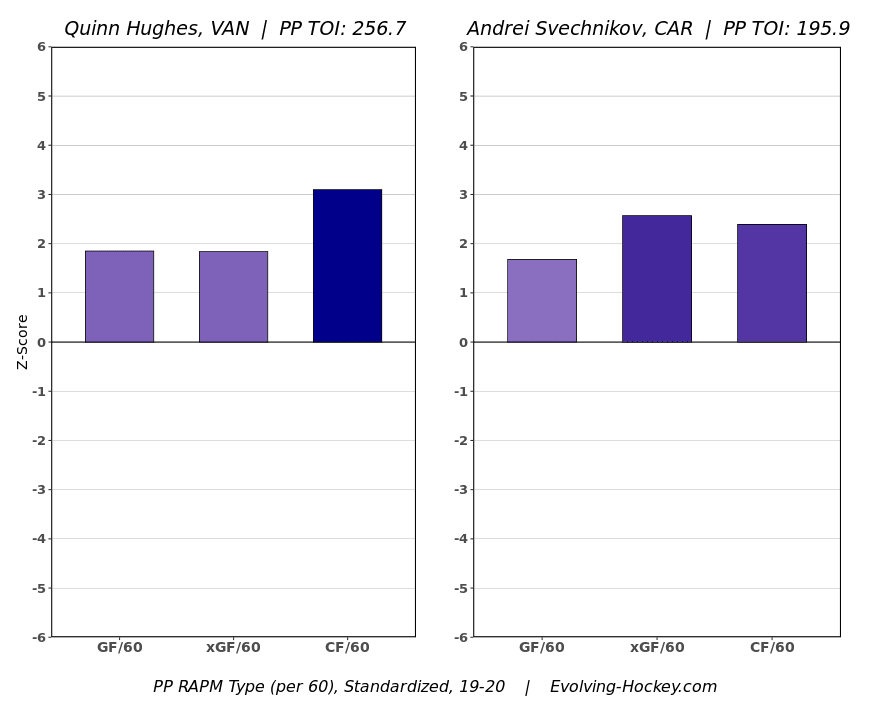 Svechnikov’s 2019-20 season is where he took a huge leap, hitting 24 goals and 61 points in 68 games. His advanced numbers were stellar as well, especially on the offensive side where he surpassed Hughes in a few categories.