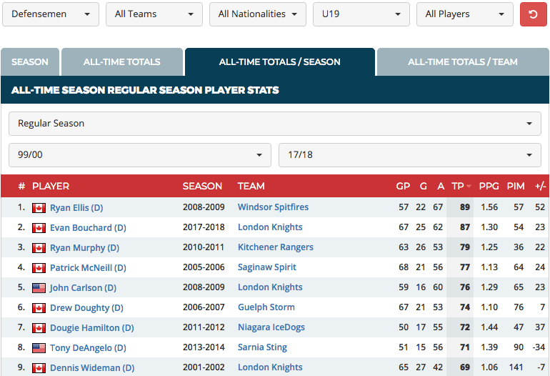 Bouchard outpaced all OHL defencemen — regardless of age — when it came to points(87), assists(62), shots(297), and primary points per game(0.9). Narrow down the criteria to sort by U19 defencemen historically and Bouchard’s production looks all the more impressive.
