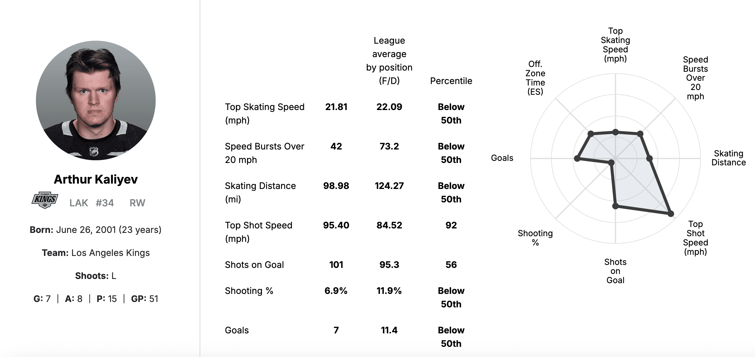 As seen on Kaliyev’s NHL Edge page below, he’s by no means a burner, but his shot, which ranked in the 92nd percentile of the league by top speed in 2023-24, has always been his most intriguing weapon.