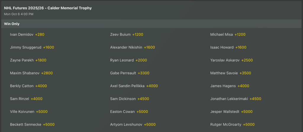 Beyond Demidov, all sorts of names pop up (and most of them at far lower odds). Minnesota’s Zeev Buium and San Jose’s Michael Misa are close in odds to finish as the runner-up for the award, but the other names aren’t far off either.