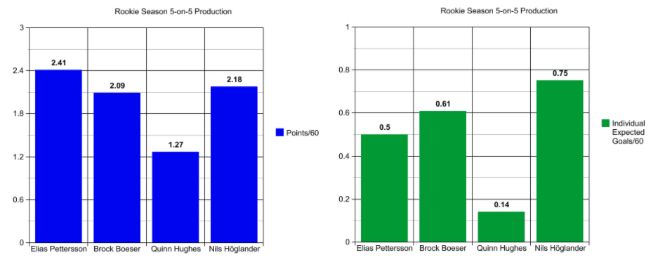 Though he won’t be mentioned much in the Calder Trophy conversation simply due to the lack of total points, Höglander has been one of the best facilitators of five-on-five offence in the league. He is currently 62nd in the NHL for five-on-five points per 60 minutes. His production at even strength is vital for the Canucks moving forward. Like I mentioned earlier, he won’t get much buzz for the Calder, but his rookie season stacks up nicely when put up against the Canucks’ last three Calder finalists.