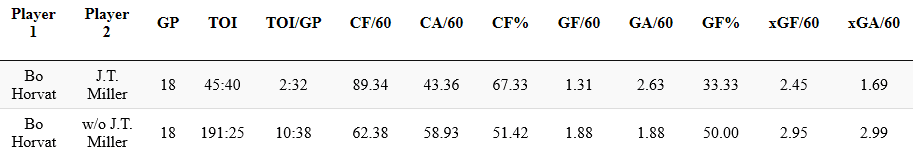 Those shot numbers will regress, but when looking at the expected goals for per 60 minutes (xGF/60) you can see that they were actually getting a bit of bad puck luck in their time together, with an on-ice shooting percentage of just 3.23%. When JT Miller is away from Horvat his team’s on ice shooting percentage is almost 13%.