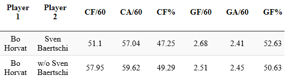 During those three seasons the Canucks were one of the worst teams in the NHL and their team GF% was 45.26%. Bo Horvat played significant time with Sven Baertschi over that time and was one of the only lines that proved to be able to score more goals than their opponents over those dark times.