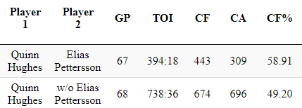 For example, Quinn Hughes had a negative CF% when he was away from Elias Pettersson, but Hughes was still very good when he was away from Pettersson.