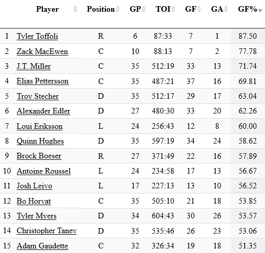 Stats provided by NaturalStatTrick, missing from photo Jake Virtanen (51.28%) and Tanner Pearson (50%).