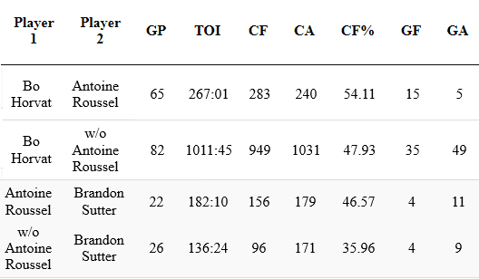 So the question is will Antoine Roussel return to Bo Horvat’s wing or will be find himself alongside Brandon Sutter. Last season Sutter and Roussel were only healthy for 22 games together. In those 22 games Roussel found himself on Sutter’s line 2/3 of the time at 5 on 5.