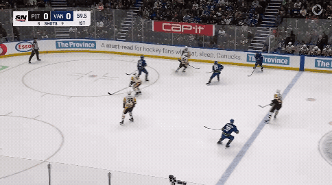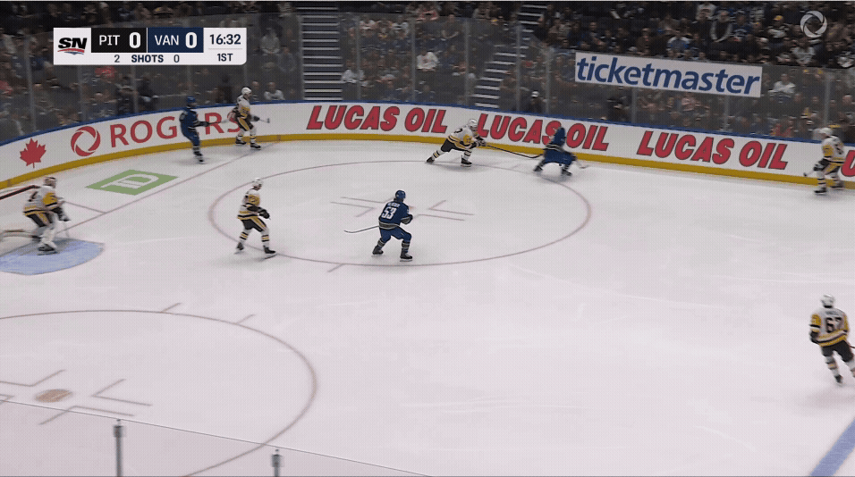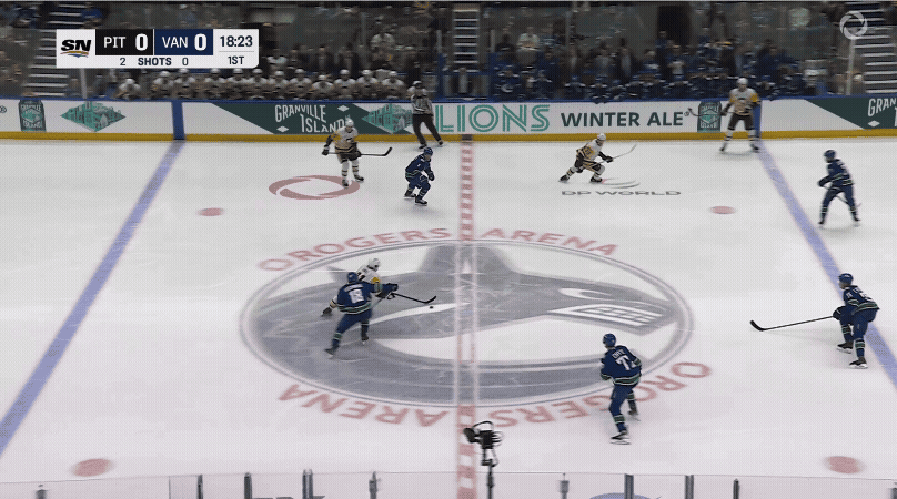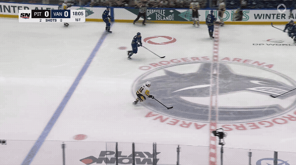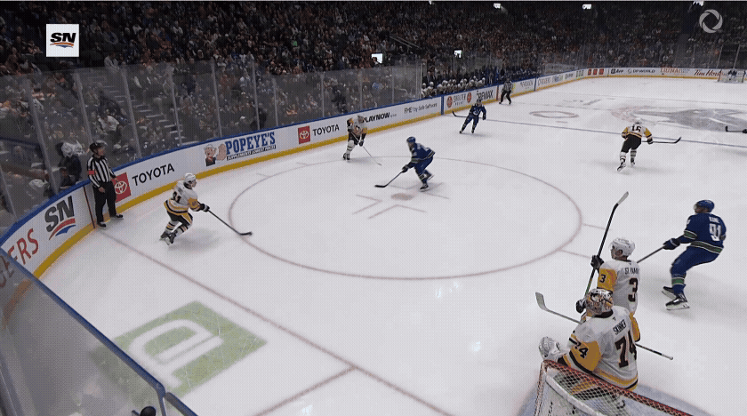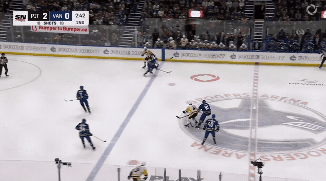 Take this excellent scoring chance early on from Conor Garland. He picks up a nifty between-the-legs pass from Kane and heads right up in the greasy areas around the net where he often makes his home. Stuart blocks his attempt with a poke check and stands tall for the ensuing rebound. Oh, and some guy named Sidney Crosby made sure he was there to collect a breakout pass and redirect the action away from Skinner and towards the Canucks zone. Who does he think he is?