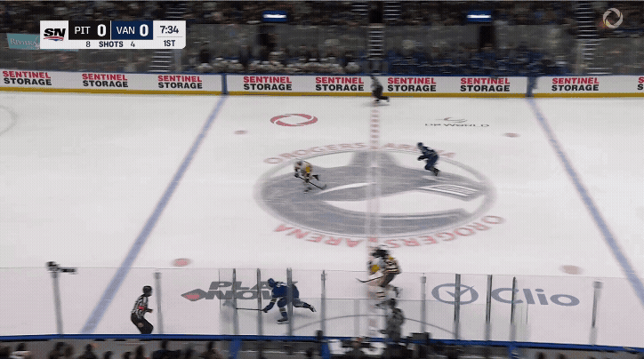 Evgeni Malkin, in no way letting age or contract rumours dull his sparkle, and Tommy Novak feed the puck to Egor Chinakhov to open the scoring, and, unfortunately, Novak took out rookie Canucks defenceman Zeev Buium with the puck in the process. Buium went down the tunnel, and to avenge their injured comrade, the Canucks…challenged the goal for being offside.
