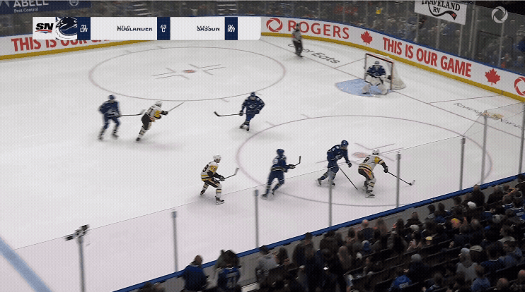 Tyler Myers is trying to help by defending (hey, that’s the name of the position!) and intercepting Tommy Novak’s shot before it can reach Evgeni Malkin on the other side of the crease. What Myers fails to account for, however, is that he is skating backwards while Lankinen is about to make a lateral movement to make the damn save on Malkin himself. Unstoppable force meets immovable object. A minor collision ensues. Quick, someone call ICBC.