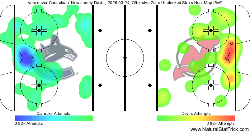 This is what the heat map will look like for Vancouver when Quinn Hughes is in Josh Allen hero ball mode with this makeshift roster. Do whatever it takes to get the puck into the crease and find a way to get it past the goalie.