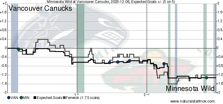 The heat map also reflects just what a one-sided game it was when it came to scoring chances. While the Wild only had a narrow 21-20 lead in overall scoring chances, the high-danger chances were a lopsided 10-2 for the visitors. That much is shown by the two drastically varying hot spots, where Minnesota had a veritable lake in front of Nikita Tolopilo, while Vancouver barely challenged Jesper Wallstedt from high-danger areas. Still, it’s interesting to see that Minnesota only got one goal at 5v5 play, and it wasn’t from one of those high-danger chances they racked up. As for the Canucks, one of their two high-danger chances was converted into a goal, which is a pretty darn good conversion rate.