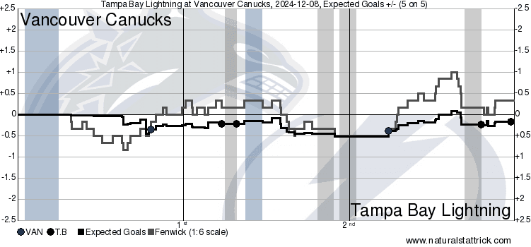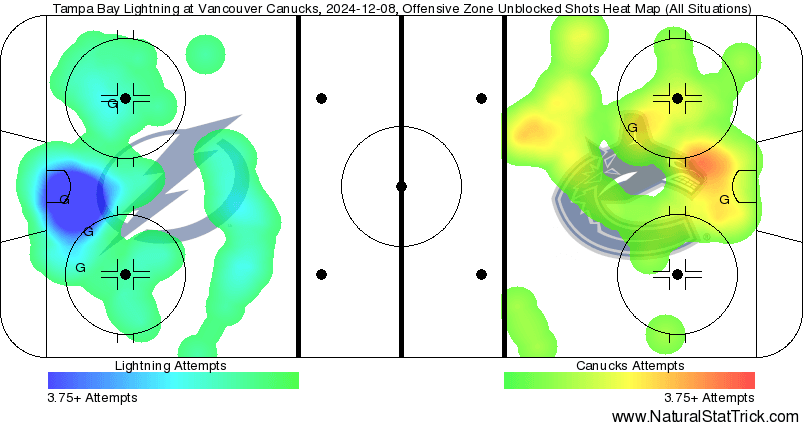 The heat map reflected the consistent manner in which the Bolts out-chanced the Canucks. At 5v5, while the scoring chances were only 20-18 in favour of Tampa, they were able to produce much higher quality looks to sit at a 12-7 advantage at even strength. That gap swelled up to 16-9 when accounting for all situations, making the heat map look a lot more favourable for the Bolts in comparison to the Canucks.
