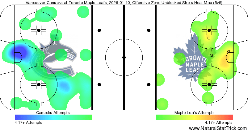 Again, does the heat map show that the Canucks were relatively better at chance generation? Yes, but it wasn’t to the extent that it might appear. Overall, the scoring chances sat at 20-19 for the Canucks who also had a 12-8 high-danger chance edge. Vancouver actually split those up pretty evenly, with 4 in each period. That being said though, considering that they had quite a lot of the puck, it showed that the Leafs did more than their fair share to limit the damage that the Canucks could’ve done. As well, it wasn’t like Vancouver was particularly threatening even from the high-danger chances, with a lack of talent and finish on full display.
