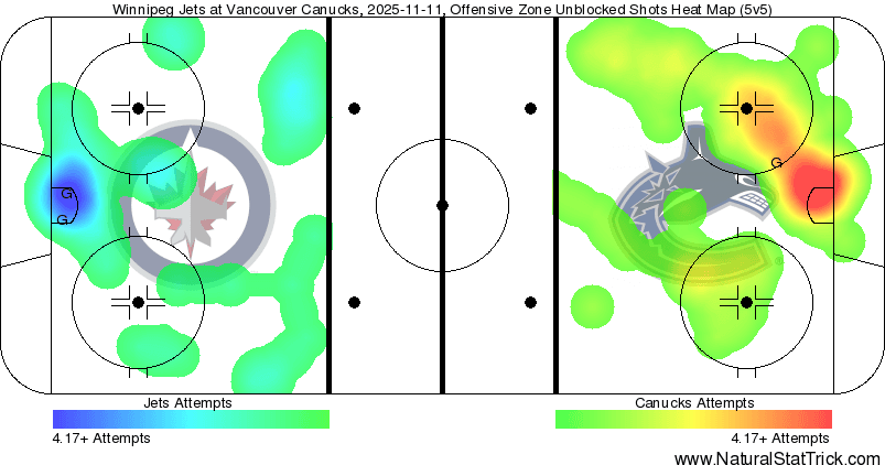 The heat map actually looks pretty favourable to the Canucks. While the high-danger chances were an even split at 10-10 during even-strength play, Vancouver held the overall edge in scoring chances by a 29-18 margin. That much is shown by the vaster areas that the Canucks’ attempts were coming from, and even a little with the larger hot spot they had in front of Connor Hellebuyck. It would’ve been nice to see them convert on their opportunities more, especially at 5v5, but outchancing the Jets is definitely a positive to take away from this loss.