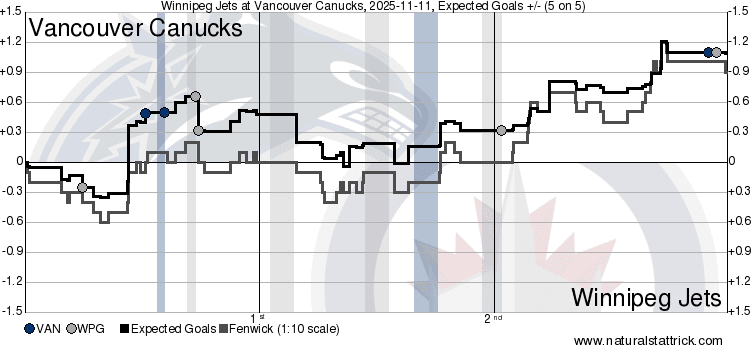 The opening period was a back-and-forth affair. The Jets got on the board early, before the Canucks delivered two goals of their own, before Winnipeg answered back with another two goals on top of that. Vancouver didn’t do too poorly in the first, actually posting a 61.30 xGF% share off a 1.28-0.81 xGF advantage. They outchanced Winnipeg 12-7 in the opening frame with a further 5-4 high-danger chance edge. There wasn’t much to note about the second period, with both teams hovering in balance and not really moving the needle. The third though saw the Canucks hold a 62.16 CF% and 78.36 xGF%, posting 1.03 xGF while only giving up 0.30 xGA. Realistically, that should’ve been plenty to get Vancouver the tying goal, but that early marker by Winnipeg did come in clutch for the visitors to put them into an advantageous position for the rest of the game.