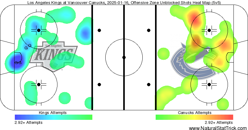 What a surprise, the Canucks failed to get high-danger chances. The scoring chances were an even 19-19 at 5v5 play, but LA had a slight 8-6 advantage in high-danger chances. Just those two were noticeable with the hot spot right in tight in the crease, while the Canucks failed to get something similar on their own end. Most notably, however, is that across five power plays, the Canucks only had one shot on net and two high-danger chances for. Simply put, that isn’t good enough, especially when there were plenty of chances on the man advantage to claw back into the game.