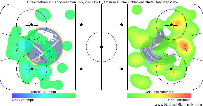 Honestly, at 5v5, this heat map was good at both ends of the ice. The Canucks got themselves a 26-13 scoring chance lead, a 10-6 high-danger chance edge within that, and made sure that the Sabres weren’t able to get all too much going. They had the relatively thicker hot spot in the low slot, which again is all one could ask for. Vancouver turned in a relatively stronger performance at both ends of the ice compared to their opposition – but unfortunately, it wasn’t enough to get the win despite the good things they did.