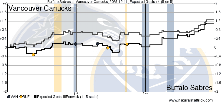 Vancouver had a steady edge for the large majority of the game, starting out strong with a 66.67 CF% edge and 55.86 xGF% lead in the first period. That only led to a 1-1 tie, but it was better than being in a massive hole with promising analytics behind them. However, the second was when they showed ever-so-slight signs of weakness, ones the Sabres took full advantage of. The share metrics weren’t even that bad, with the Canucks recording a 46.43 CF% and 45.10 xGF% – but that was all Buffalo needed to pull ahead 3-2. The third, especially towards the end, saw Vancouver hounding their opposition, but despite an 83.33 CF%, 89.57 xGF% off a 1.22-0.14 xGF tilt, the Canucks weren’t able to convert.