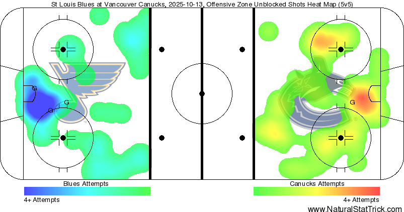 The heat map is further confirmation of what the eye test and numbers showed. Vancouver was quite ineffective at generating their own scoring chances and high-danger chances, while St. Louis was able to do both of these in bunches. The Blues held a 15-10 high-danger chance edge at 5v5, managing to maximize their offence at even strength where the Canucks really couldn’t get anything going. And with 52:11 of 5v5 action, that’s a problem for Vancouver.