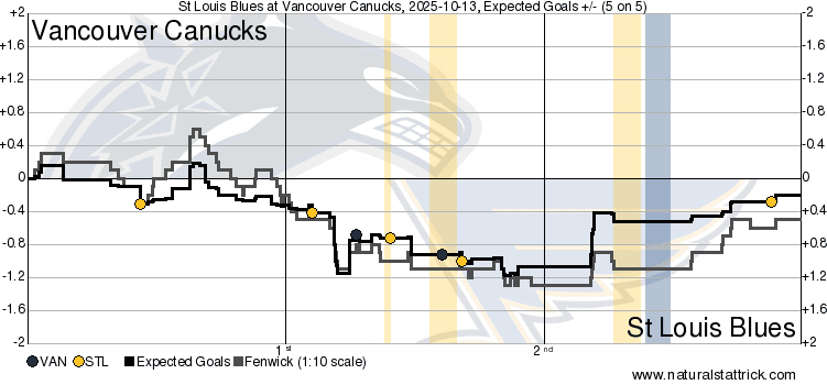 Extra Seasoning Required: For all of the good things that Braeden Cootes did during training camp and the preseason, it’s becoming apparent that he isn’t thriving in the role that the Canucks have him deployed in thus far into the year. On a line with O’Connor and Jonathan Lekkerimaki, the trio were absolutely plastered against the Blues, recording a team-worst 13.04 CF% and 6.94 xGF%. That’s right, they didn’t even manage to break a 10% share of the expected goals during their TOI, which wasn’t insignificant given that they played the second-most minutes of any forward line at 5v5 action. Giving up 7 high-danger chances without getting a single high-danger chance of their own looks bad on paper, but gets even more when considering that all of their faceoff starts came in the offensive zone. Suffice it to say that they’re not clicking very well.