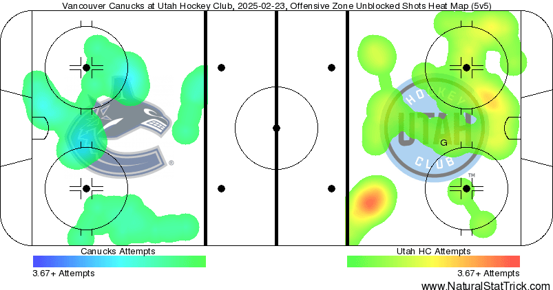 As the heat map shows, there weren’t a ton of scoring chances to speak of last night. Both teams didn’t see much 5v5 time but still didn’t make the most of it. Utah held a 15-7 scoring chance advantage, with both teams splitting a 5-5 high-danger chance battle at even strength and neither team establishing much of a hot spot in front of the crease area. Accounting for all situations, that scoring chance battle jumps to 25-19 in favour of Utah, while the high-danger chances balanced out once more at 9-9. There really just wasn’t a lot of action.