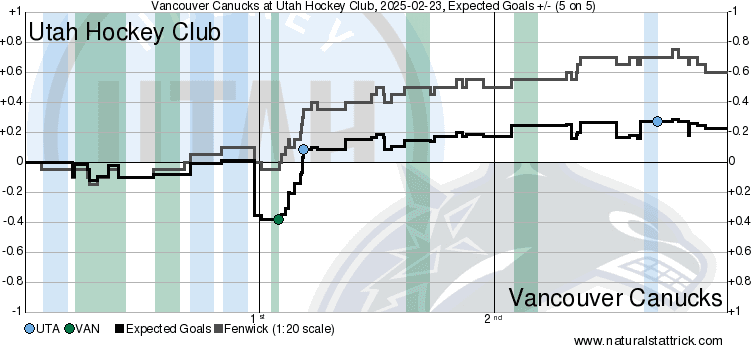 With the first period being bogged down by penalties, there wasn’t much 5v5 time for either team to get into a rhythm. However, coming out of the intermission, it looked like the Canucks were going to take the initiative. They had a good stretch run that led to a power play, where they capitalized for the opening goal of the game. After that, though…there wasn’t much to speak of. Actually, they just let Utah run away with the momentum. The hosts finished the period with a dominating 62.86 CF% and 78.51 xGF%, completely taking away anything Vancouver managed to create at the start of the frame. This only continued into the third, with Utah playing more than solid enough to ensure the Canucks never managed to seize the initiative again in this loss.